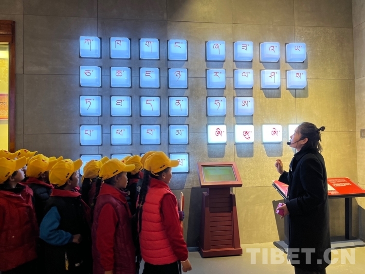 走進(jìn)“藏地智慧”,學(xué)生們一眼認(rèn)出藏文創(chuàng)始人吞彌·桑布扎,大家異口同聲回答講解員的問題說:“這是吞彌·桑布扎。”得到講解員的肯定、并向他們講述背后的相關(guān)歷史后,學(xué)生們聽得很入迷,也更有信心面對接下來的問題。藏文的信息化使得這一古老文字煥發(fā)著全新而旺盛的生命力,在這里學(xué)生們欣賞藏文在智能手機(jī)、電腦、多功能點讀機(jī)等智能電子設(shè)備內(nèi)“走動”、傳統(tǒng)農(nóng)牧業(yè)的模擬場景和現(xiàn)代化的機(jī)械設(shè)備圖、藏醫(yī)藥材、藏香藏紙制造和制鹽過程等獨具特色的藏族傳統(tǒng)手工藝,也能很好的回答講解員提出的問題,現(xiàn)場互動氣氛熱烈?!斑@種活動我們學(xué)校不會常有,當(dāng)孩子們聽到要去拉薩時像是要過年那樣高興,一路上問這問那地充滿好奇?!倍喟奏l(xiāng)小學(xué)的帶隊老師羅珍介紹:“這次參加活動的這些學(xué)生都是三、四、五年級的學(xué)生,個個品學(xué)兼優(yōu)?!?/p>
