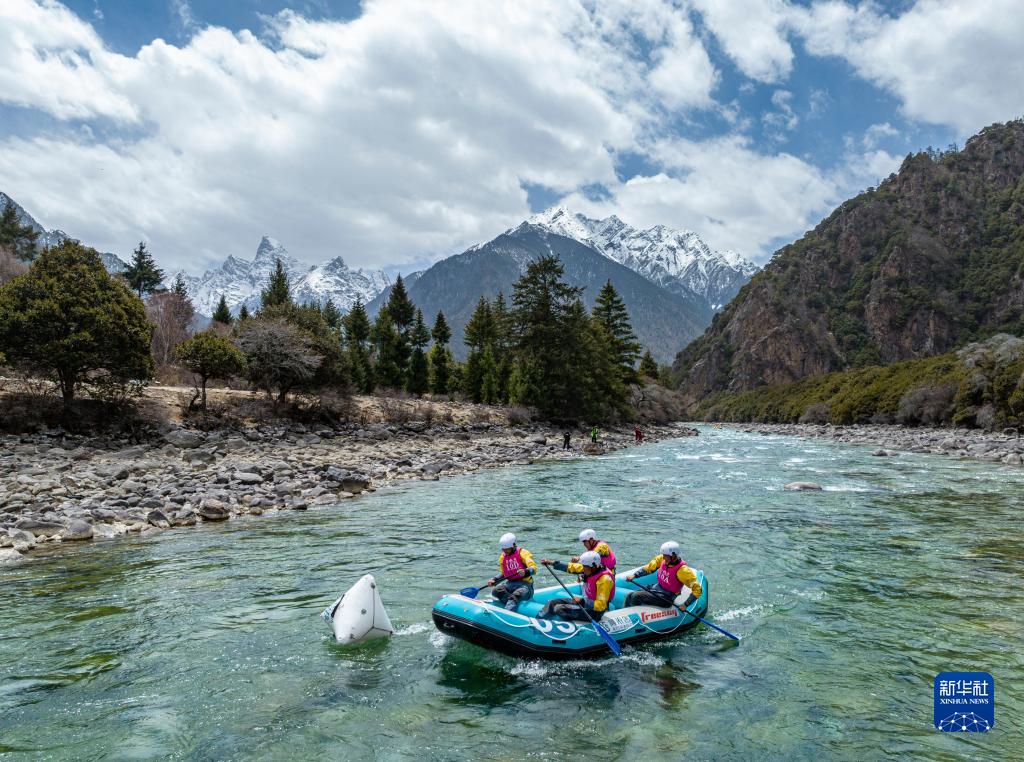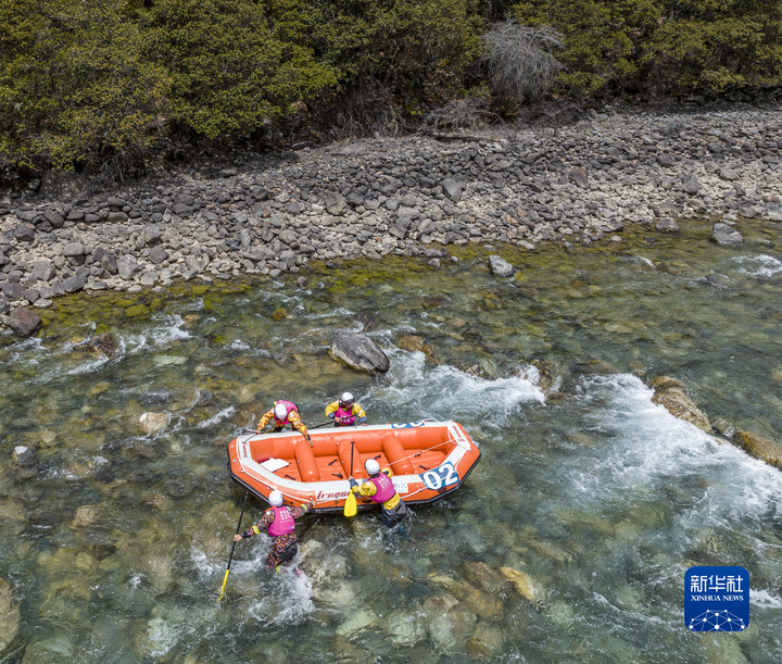 4月16日,“西藏旅游股份有限公司漂流隊”選手在激流漂流筏繞標賽中,他們最終獲得季軍(無人機照片)。新華社記者 孫非 攝