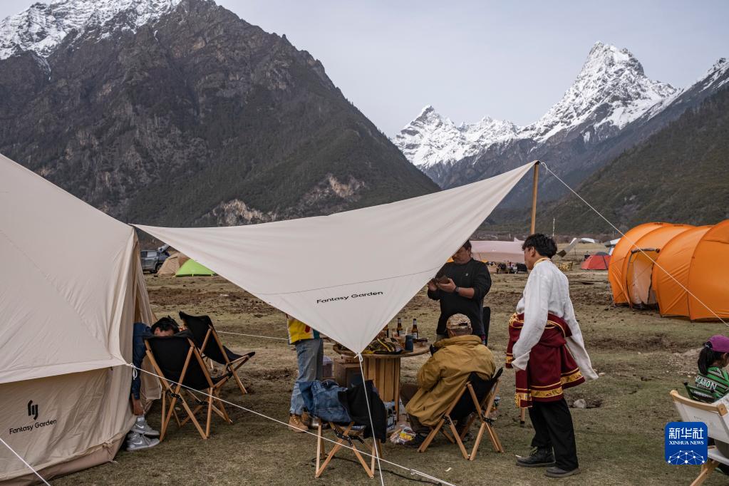 4月15日,游客在巴松措附近體驗(yàn)露營生活。新華社記者 黃耀漫 攝
