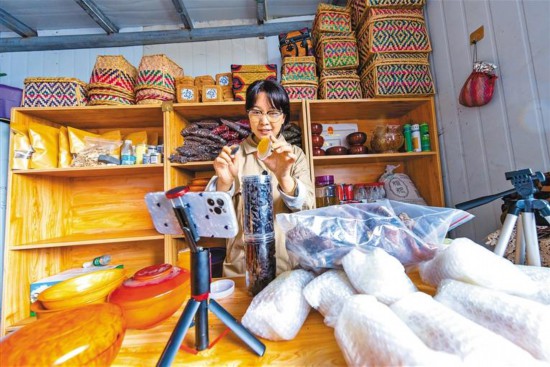 圖為日喀則市吉隆縣吉隆鎮(zhèn)吉甫村村民朗薩通過電商平臺銷售當?shù)靥禺a(chǎn)。記者 格桑吉美 攝
