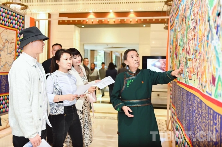 圖為格日勒老人(右)向嘉賓介紹“倉央嘉措馬鬃繞線長卷故事唐卡”