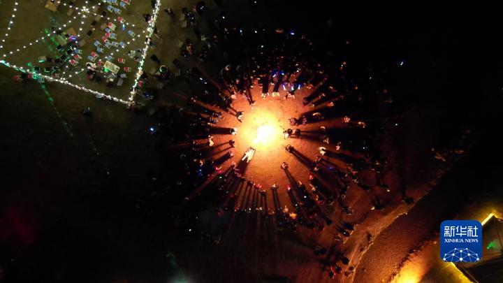4月27日,游客們在“過林卡”現(xiàn)場跳起鍋莊舞,氣氛熱烈(無人機(jī)照片)。新華社記者聶毅 攝