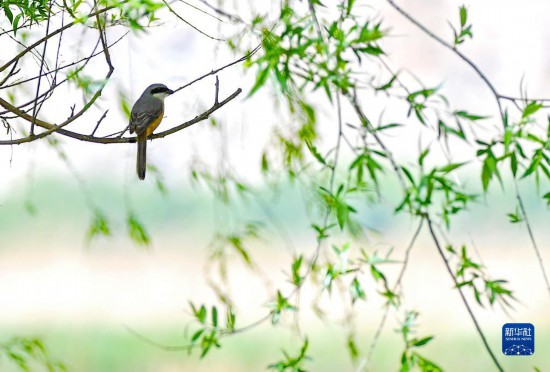 拉魯濕地樹(shù)枝上一只四處觀望的灰背伯勞(5月6日攝)。新華社記者 張汝鋒 攝