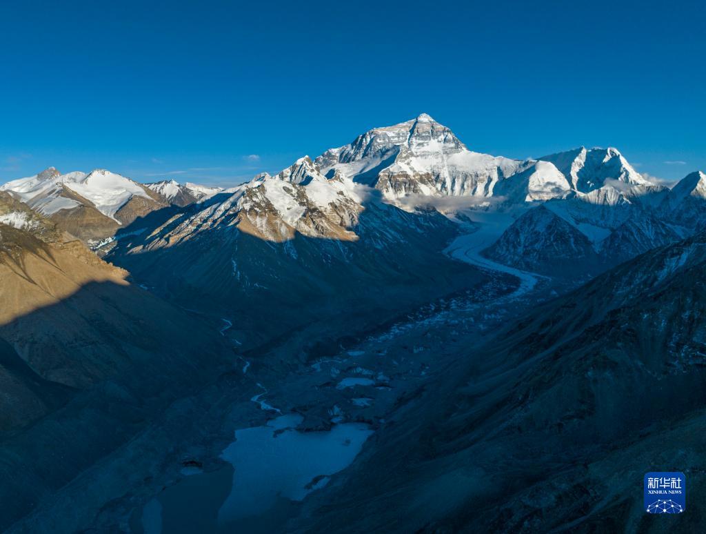 這是日落時分的珠峰和絨布冰川(5月16日攝,無人機照片)。新華社記者 孫非 攝