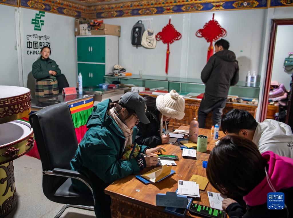 在珠峰游客大本營(yíng)的郵政所,游客在寫明信片(5月13日攝)。新華社記者 孫非 攝