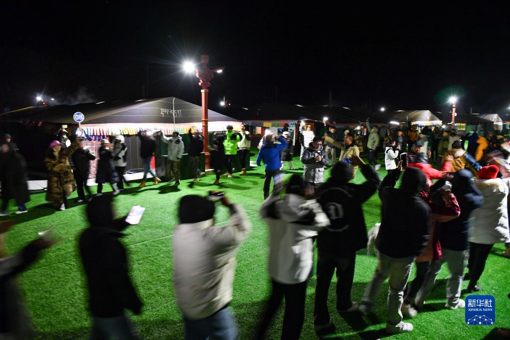 在珠峰游客大本營(yíng),游客在帳篷旅館間的空地上唱歌跳舞(5月16日攝)。新華社記者 晉美多吉 攝