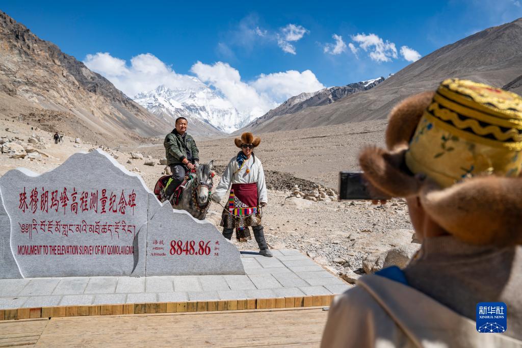 在珠峰大本營(yíng)的珠峰高程測(cè)量紀(jì)念碑前,游客拍照留念(5月20日攝)。新華社記者 孫非 攝