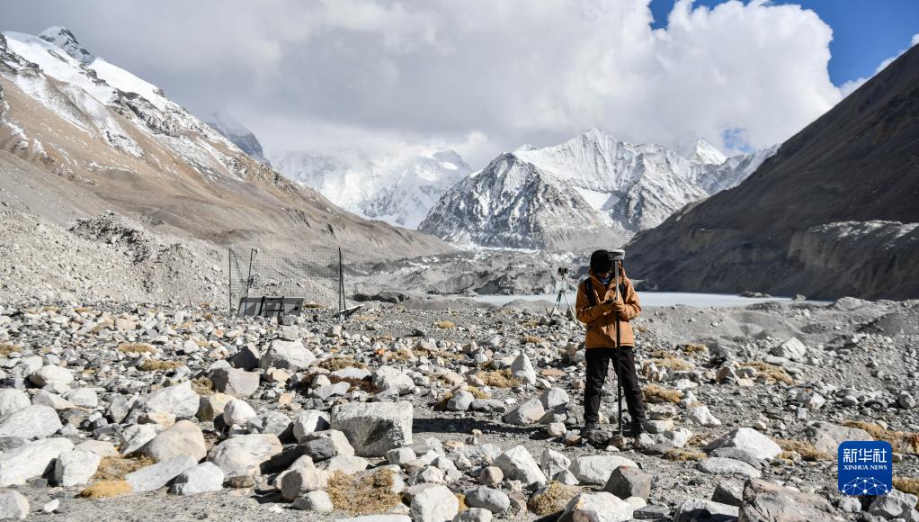 在珠峰登山大本營附近,科考隊員對冰川進行實時差分GPS定位(5月15日攝)。新華社記者 晉美多吉 攝