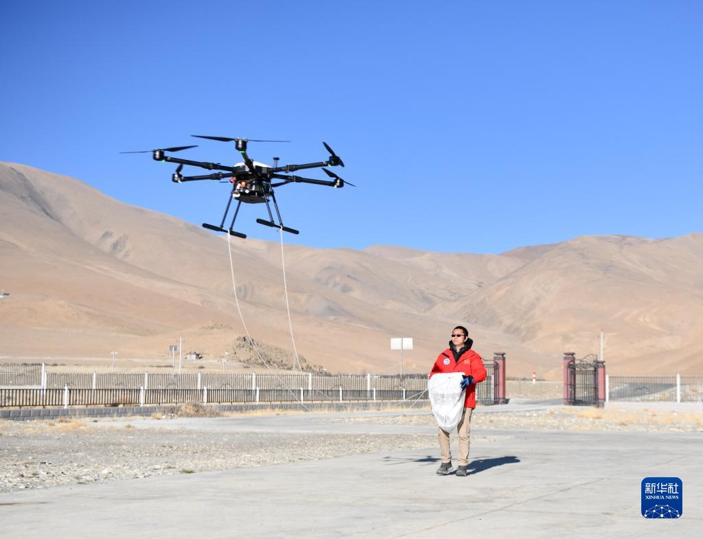 在中國科學(xué)院珠穆朗瑪大氣與環(huán)境綜合觀測研究站,科考隊員放飛無人機采集空氣樣本(5月10日攝)。新華社記者 晉美多吉 攝