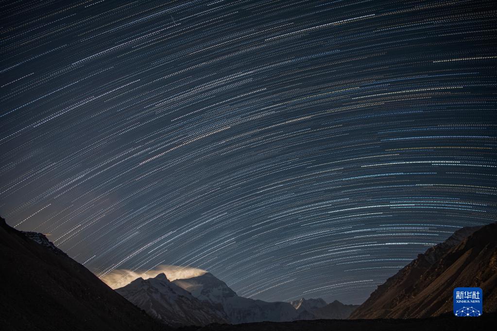 這是5月23日在珠峰大本營(yíng)拍攝的星軌(合成照片)。新華社記者 孫非 攝