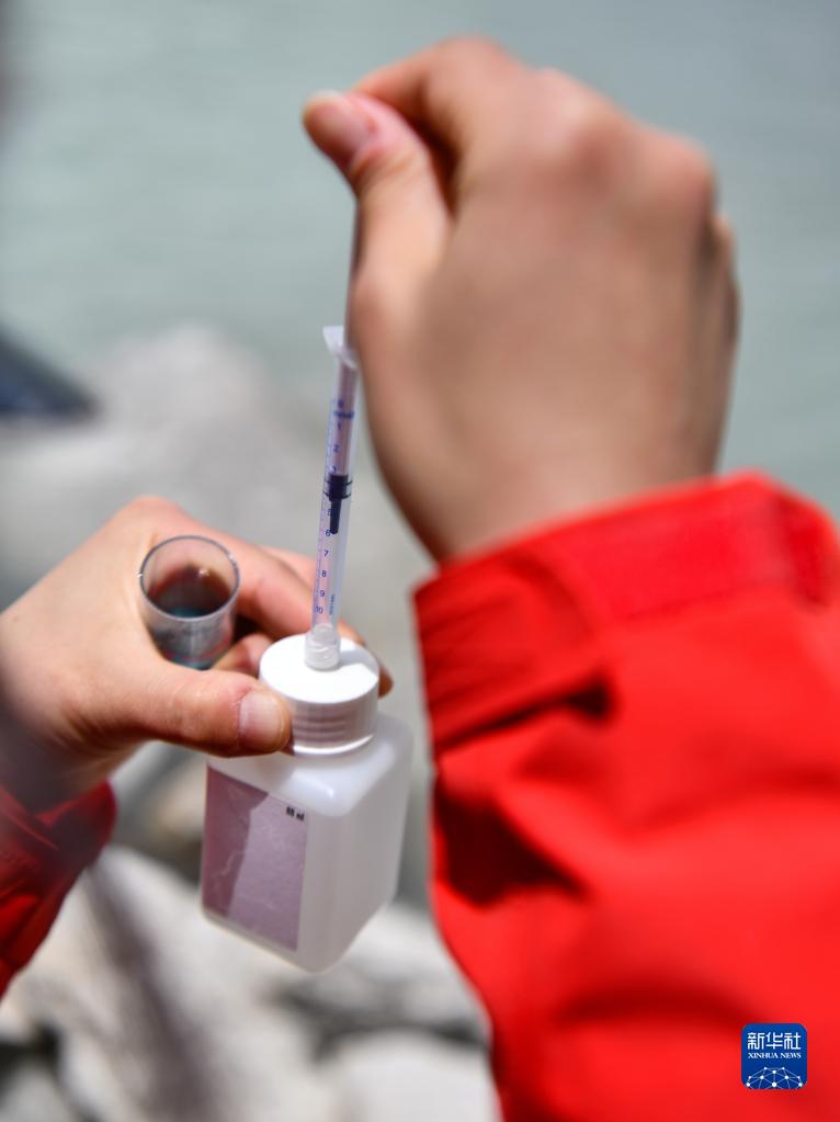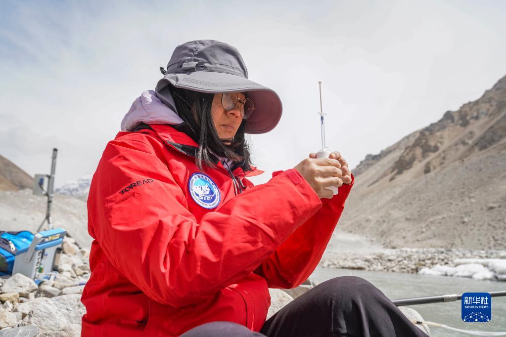 在珠峰登山大本營附近,來自中國科學(xué)院青藏高原研究所的科考隊員邱海英在檢測絨布冰川末端水質(zhì)(5月14日攝)。新華社記者 孫非 攝