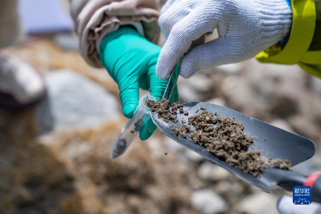 在珠峰登山大本營附近,來自西藏大學(xué)生態(tài)環(huán)境學(xué)院的科考隊員在收集土壤樣本(5月22日攝)。新華社記者 孫非 攝