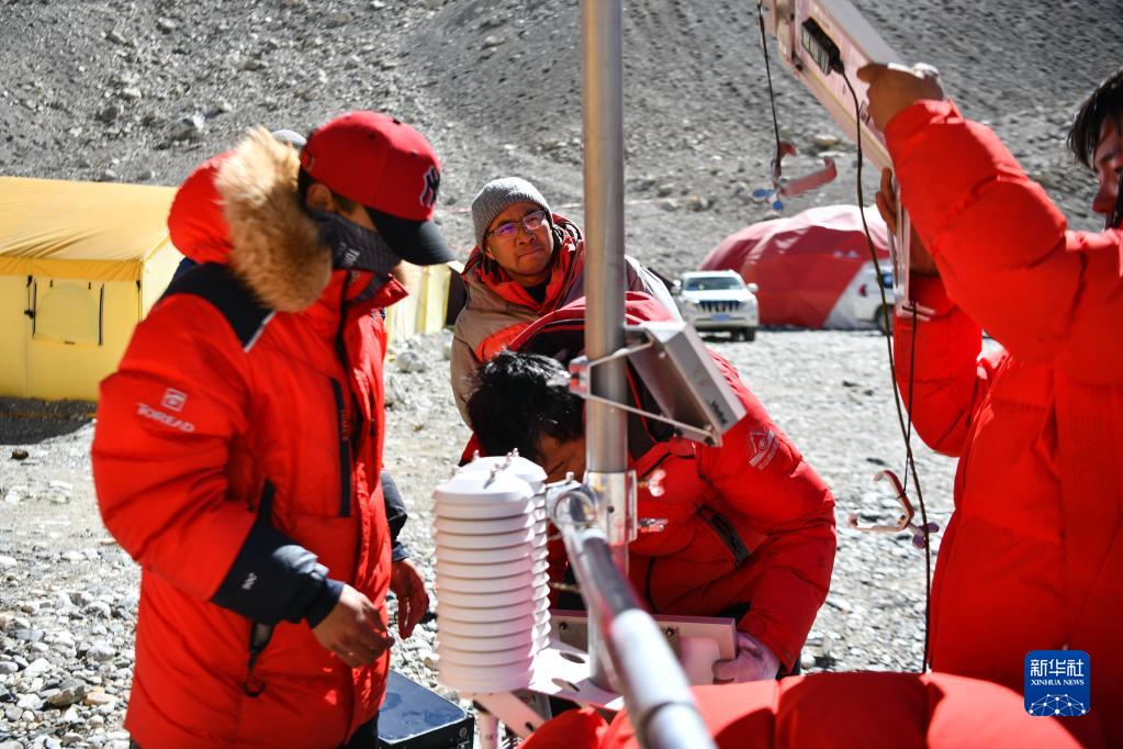 在珠峰登山大本營附近,第二次青藏科考高海拔氣象梯度觀測小組負責(zé)人趙華標(中)在指導(dǎo)科考登頂隊隊員架設(shè)自動氣象站(5月9日攝)。新華社記者 晉美多吉 攝