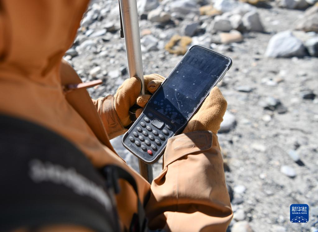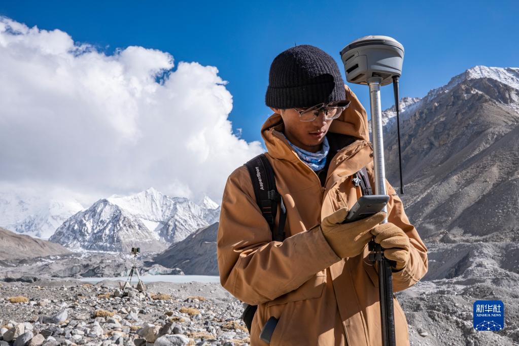 在珠峰海拔約5300米處,來自中國科學(xué)院西北生態(tài)環(huán)境資源研究院的科考隊員薛雨昂在對冰川進行實時差分GPS定位(5月15日攝)。新華社記者 晉美多吉 攝