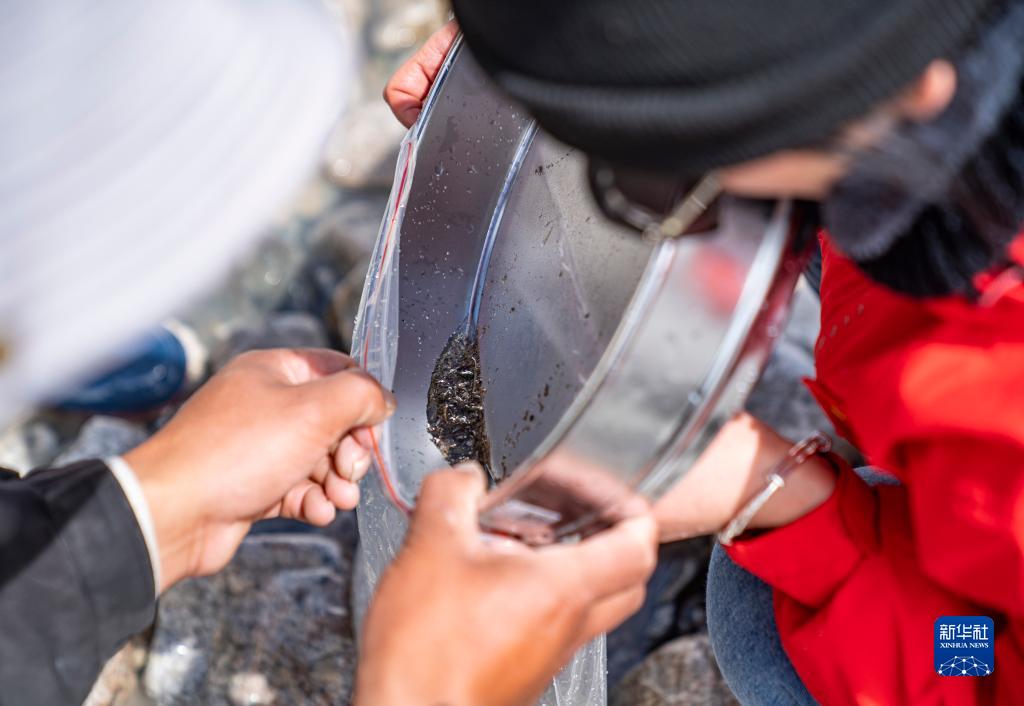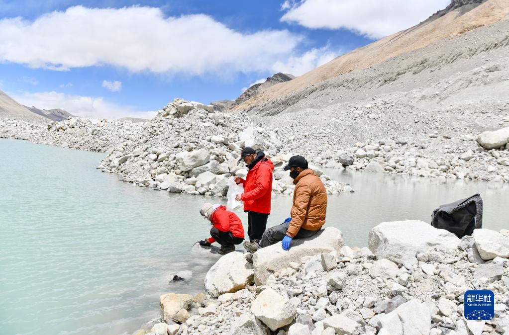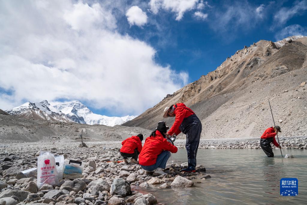 在珠峰登山大本營附近,來自西藏大學(xué)生態(tài)環(huán)境學(xué)院的科考隊員在采集水生生物樣本(5月22日攝)。新華社記者 孫非 攝