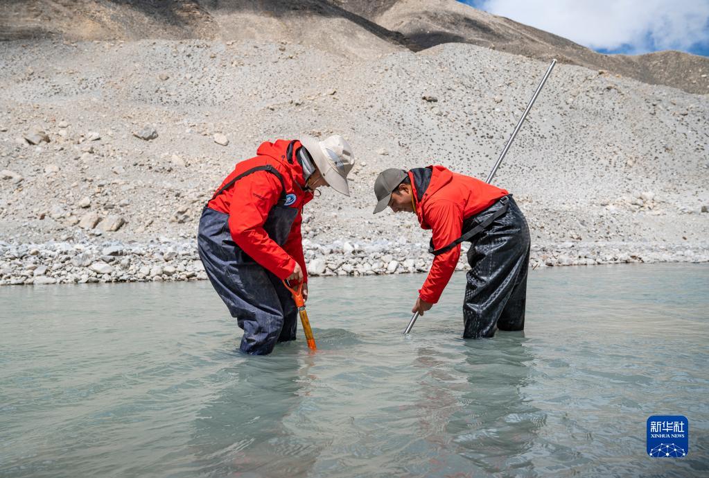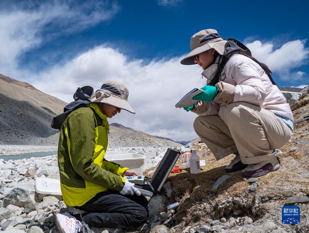 在珠峰登山大本營附近,來自西藏大學(xué)生態(tài)環(huán)境學(xué)院的科考隊員在進行水生態(tài)調(diào)查(5月22日攝)。新華社記者 孫非 攝