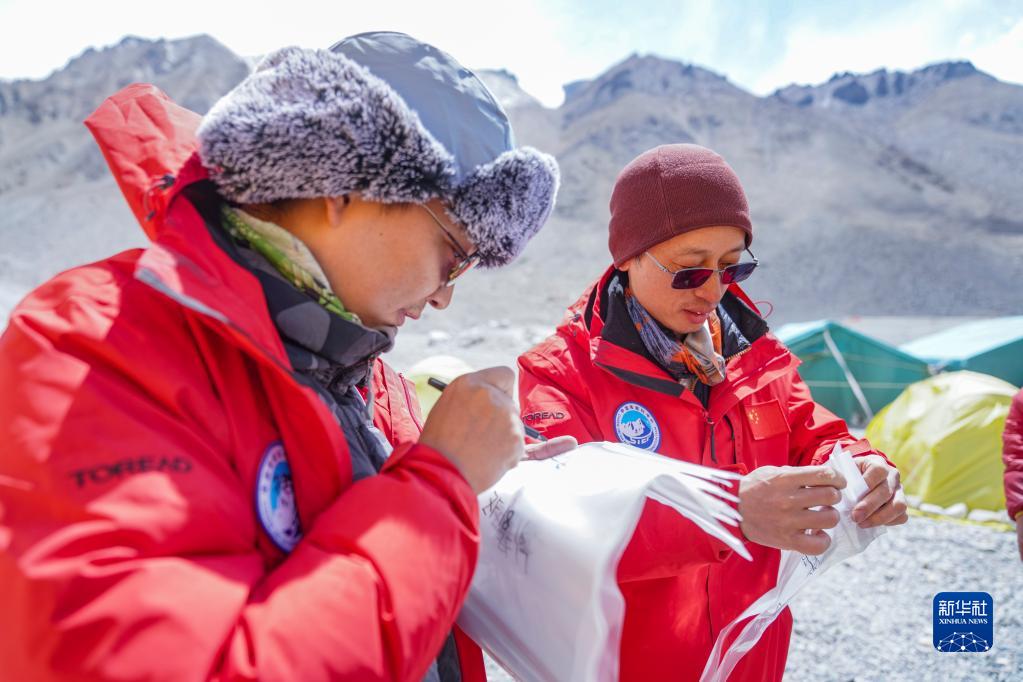在珠峰登山大本營,中國科學(xué)院西雙版納熱帶植物園研究員蘇濤(右)和同事在樣品自封袋上做標記(5月14日攝)。新華社記者 孫非 攝