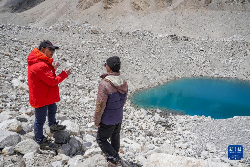在珠峰海拔約5300米處,中國科學(xué)院西北生態(tài)環(huán)境資源研究院副院長康世昌(左)和科考隊員討論冰面湖的形成原因(5月14日攝)。新華社記者 孫非 攝