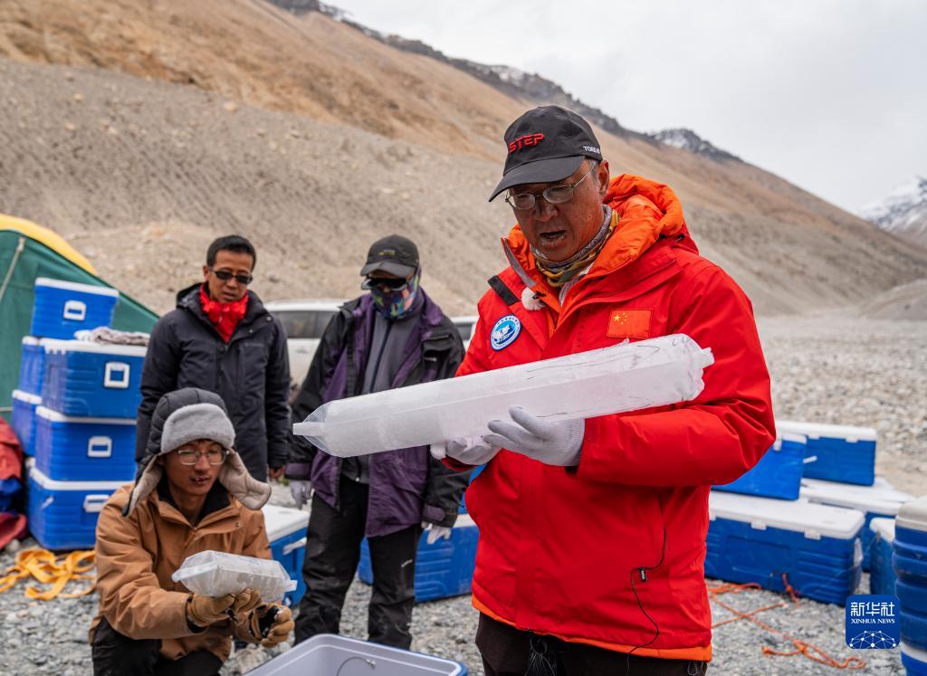 在珠峰登山大本營,中國科學(xué)院西北生態(tài)環(huán)境資源研究院副院長康世昌(右)在查看從珠峰海拔約6500米處鉆取的冰芯樣品(5月22日攝)。新華社記者 孫非 攝
