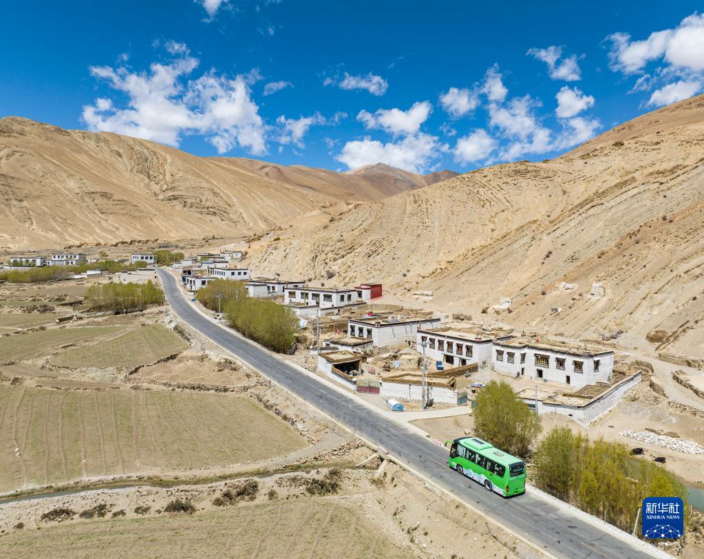 一輛載有游客的環(huán)保大巴車正駛向珠峰(5月25日攝,無人機(jī)照片)。新華社記者 孫非 攝