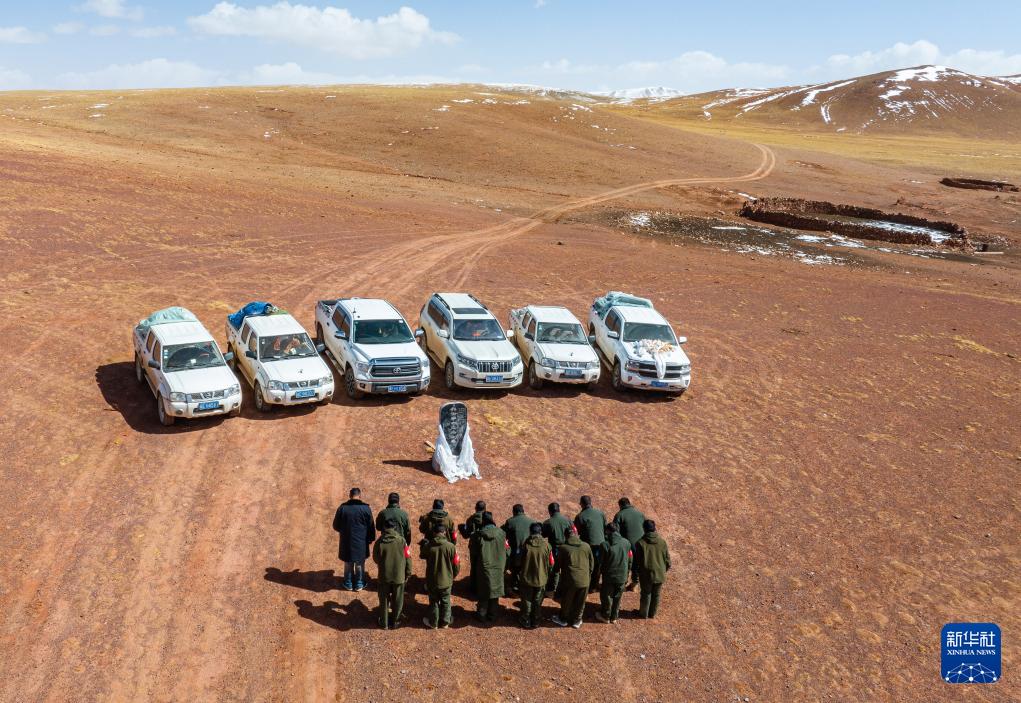 野生動(dòng)物專(zhuān)業(yè)管護(hù)隊(duì)員在無(wú)人區(qū)深處的羅布玉杰烈士紀(jì)念碑前默哀致敬。羅布玉杰2002年在與盜獵分子的槍?xiě)?zhàn)中犧牲(無(wú)人機(jī)照片,5月10日攝)。新華社記者 姜帆 攝
