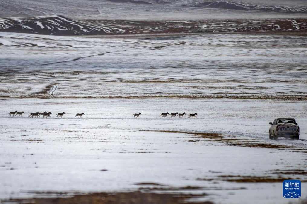 成群的藏野驢從野生動(dòng)物專(zhuān)業(yè)管護(hù)隊(duì)員們的車(chē)前跑過(guò)(5月9日攝)。新華社記者 姜帆 攝 ??