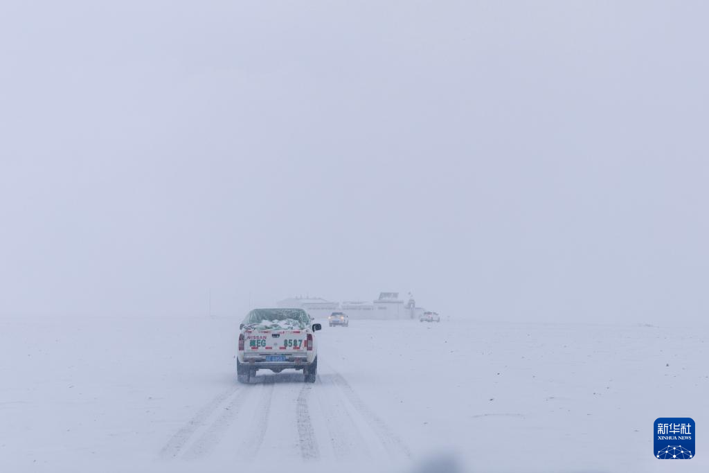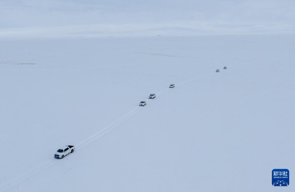 ??野生動(dòng)物專(zhuān)業(yè)管護(hù)隊(duì)員的車(chē)隊(duì)在大雪中巡護(hù)(無(wú)人機(jī)照片,5月8日攝)。新華社記者 丁增尼達(dá) 攝