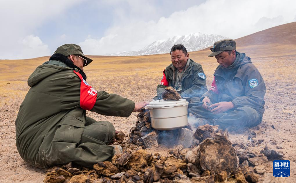??野生動(dòng)物專(zhuān)業(yè)管護(hù)隊(duì)員在巡護(hù)途中就地取材,用野牦牛糞生火做飯(5月10日攝)。新華社記者 丁增尼達(dá) 攝