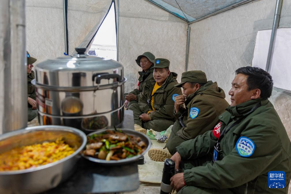 ??野生動(dòng)物專(zhuān)業(yè)管護(hù)隊(duì)員們?cè)谒逘I(yíng)的帳篷中準(zhǔn)備吃飯(5月7日攝)。新華社記者 姜帆 攝