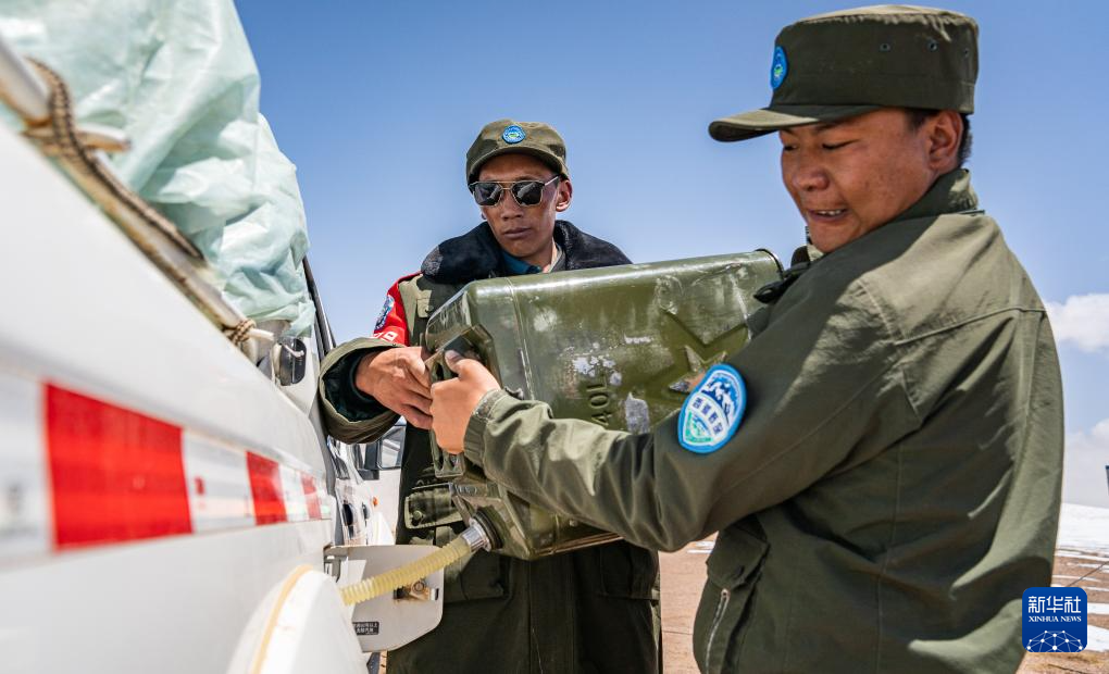 ??野生動(dòng)物專(zhuān)業(yè)管護(hù)隊(duì)員在巡護(hù)途中給車(chē)輛加油(5月9日攝)。新華社記者 丁增尼達(dá) 攝