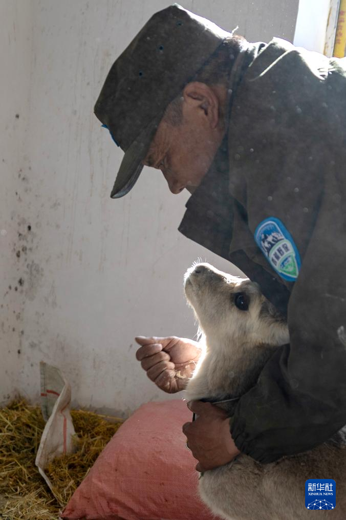 ??羅布玉杰站的野生動(dòng)物專(zhuān)業(yè)管護(hù)隊(duì)員在出發(fā)巡護(hù)前給站里救護(hù)的受傷藏原羚喂糌粑(5月7日攝)。新華社記者 姜帆 攝