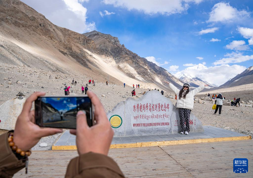 游客在珠穆朗瑪峰高程測量紀(jì)念碑前拍照留念(5月24日攝)。新華社記者 孫非 攝