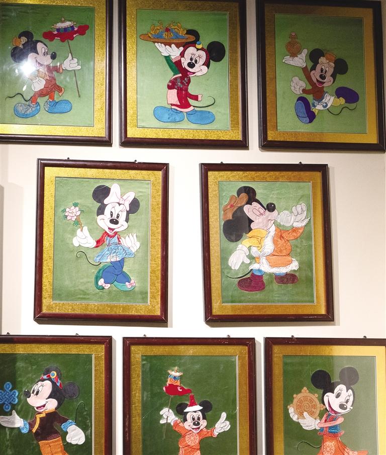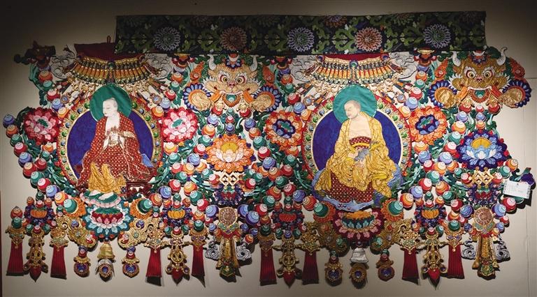 堆繡唐卡距今已有600多年的歷史,是藏民族特有的民間手工和繪畫技法相結合的造型藝術,包括刺繡、馬尾繡、堆貼、鑲嵌等技藝,材料以綢緞、珠寶、金銀線等為主,精選各色圖紋錦緞組合構成,頗具立體感。
