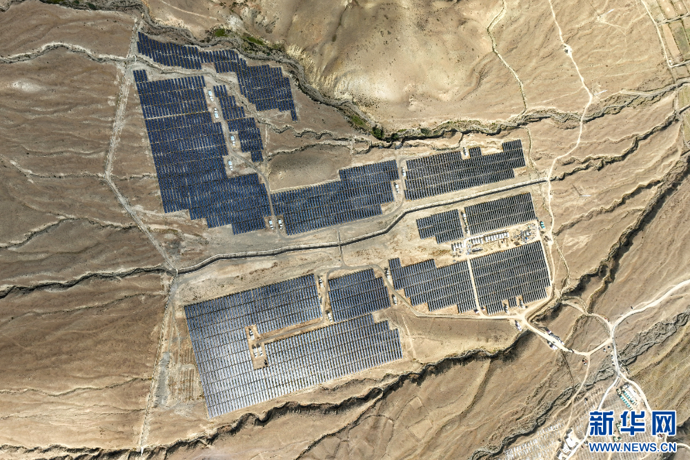 圖為110千伏協(xié)合措美縣20兆瓦(MW)并網(wǎng)光伏電站(無(wú)人機(jī)照片)。新華網(wǎng) 旦增努布 攝