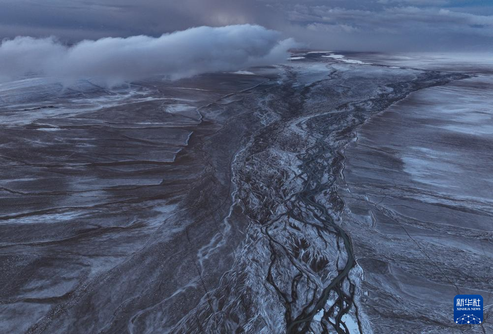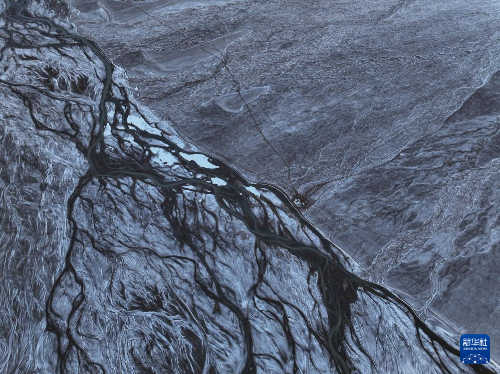 藏羚羊排隊走過甜水河河床,留下整齊的印跡(6月15日攝,無人機照片)。新華社記者 晉美多吉 攝