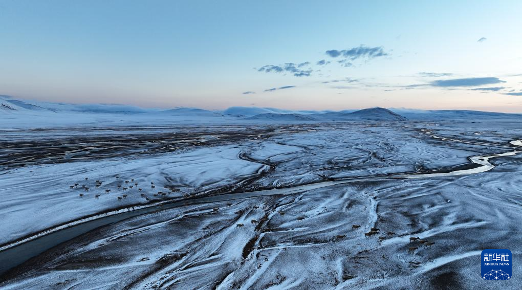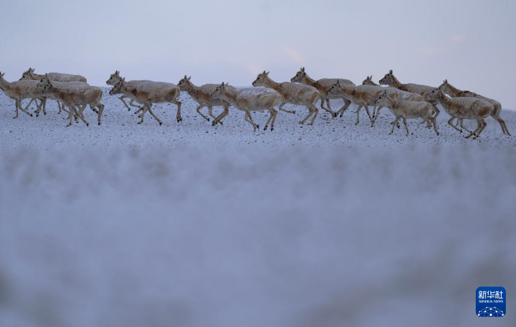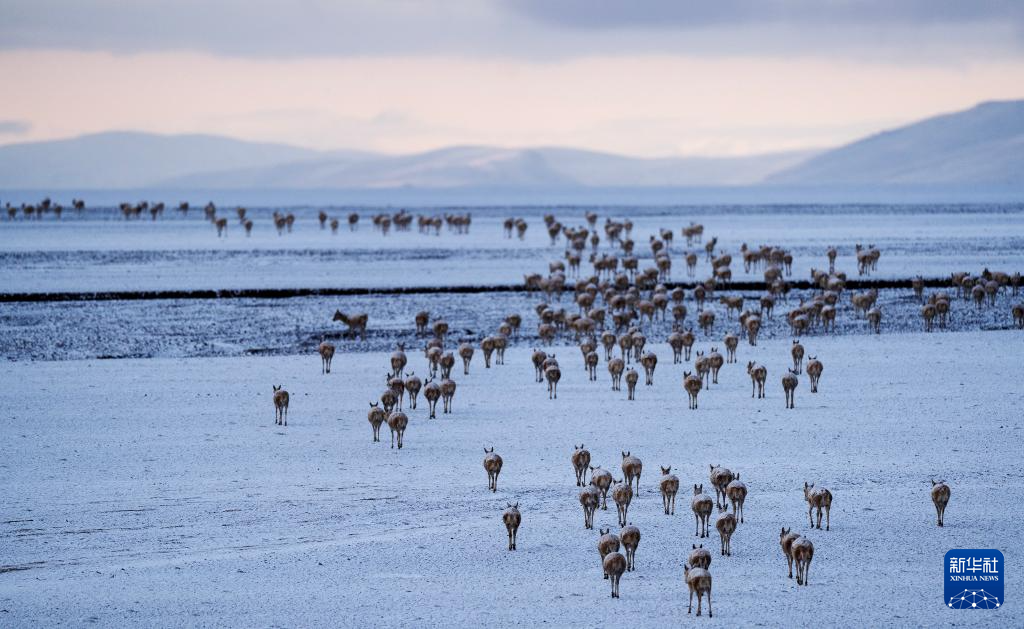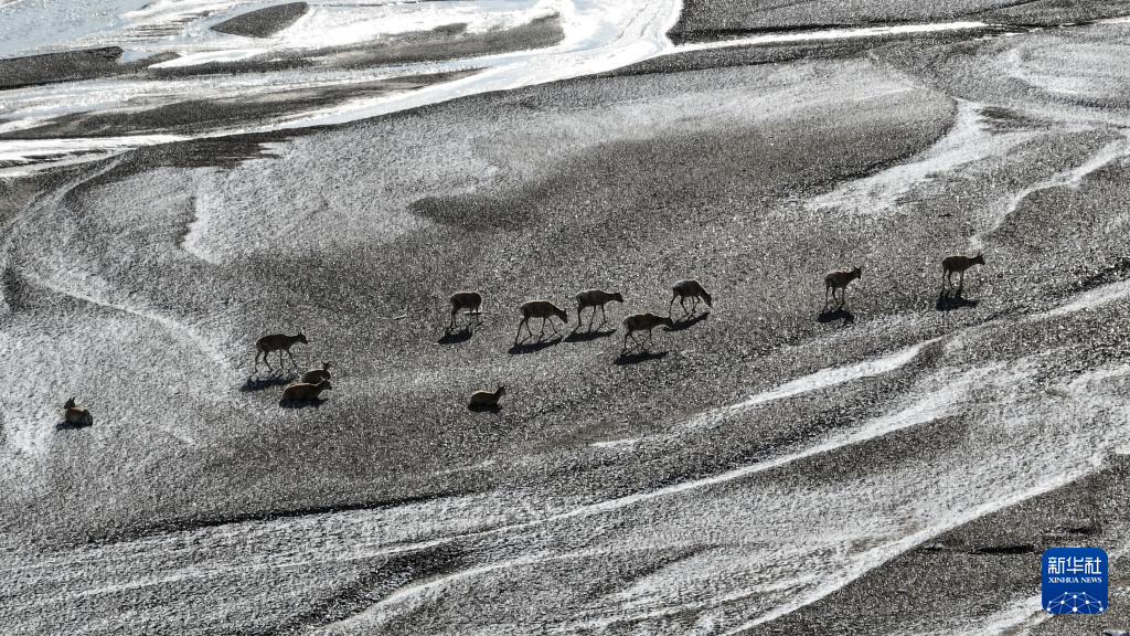 藏羚羊在甜水河畔雪地荒灘上向產(chǎn)羔地遷徙(6月15日攝)。新華社記者 姜帆 攝