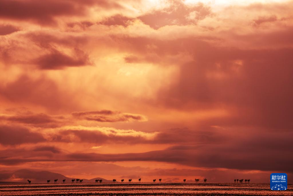 6月15日清晨雪后,在羌塘國家級(jí)自然保護(hù)區(qū),迎著朝霞前行在遷徙路上的一群藏羚羊。新華社記者 費(fèi)茂華 攝