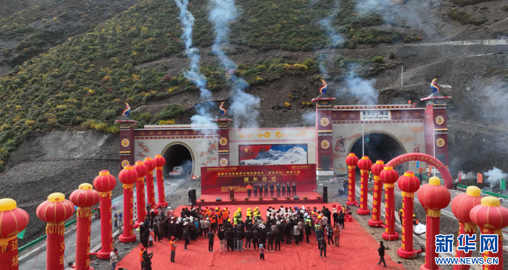 這是夏貢拉山隧道通車儀式現場(9月29日攝,無人機照片)。新華社發(fā)