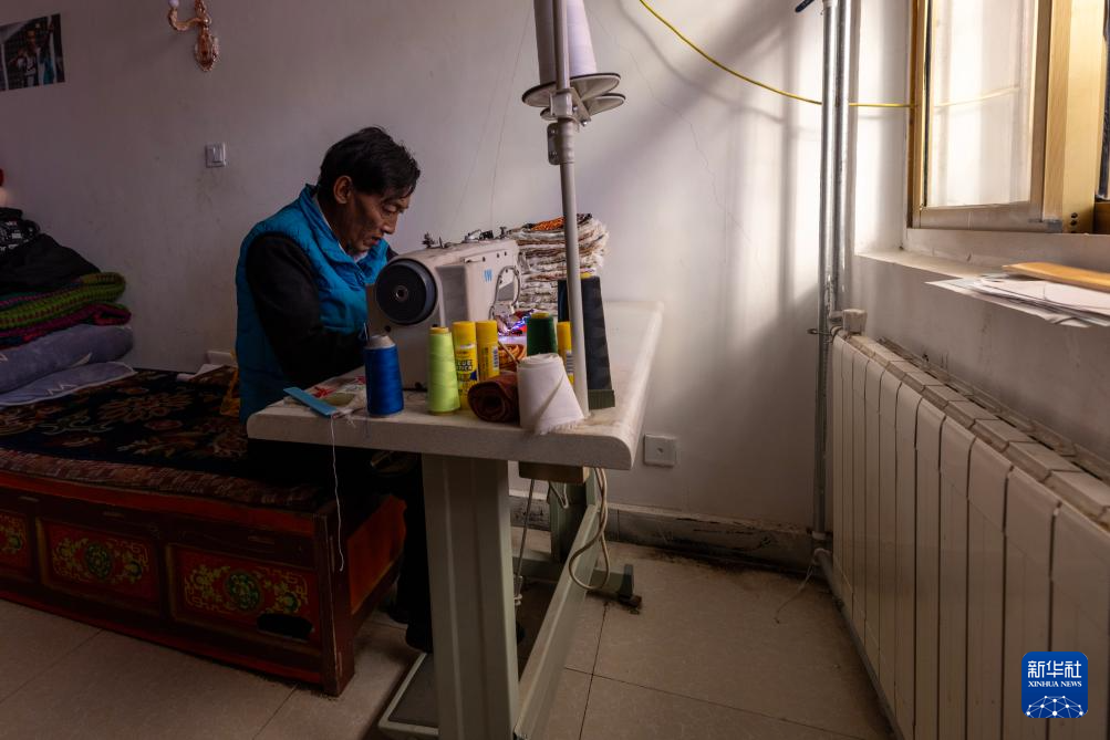 措勤縣扎日南木錯(cuò)社區(qū)居民林瓊在自家的暖氣房內(nèi)制作傳統(tǒng)民族帽飾(11月20日攝)。新華社記者 姜帆 攝 ??
