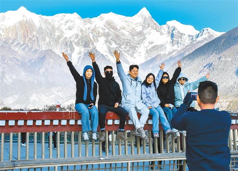 圖為12月13日,游客在米林市索松村觀景臺與南迦巴瓦峰合影。記者 劉楓 王珊 攝