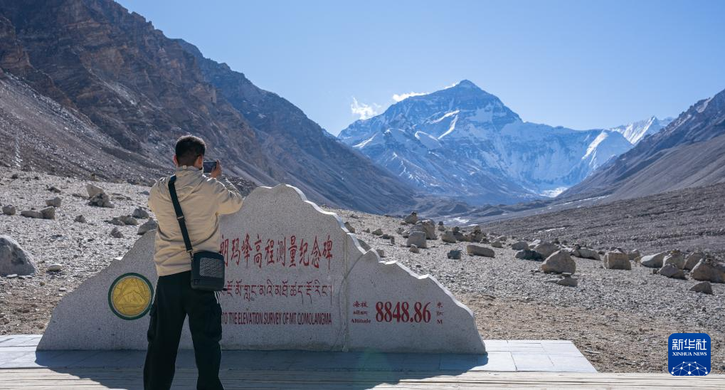 12月14日,游客在珠穆朗瑪峰高程測量紀(jì)念碑旁拍照留念。新華社記者 丁增尼達 攝