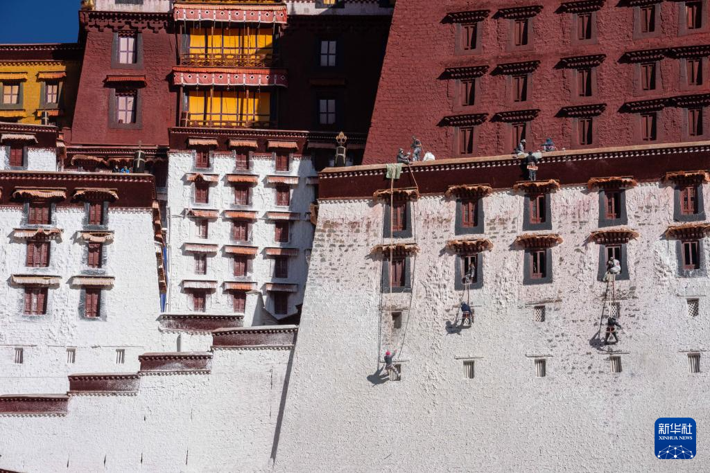 10月30日,布達拉宮管理處的工作人員在噴灑涂料。新華社記者 旦增尼瑪曲珠 攝