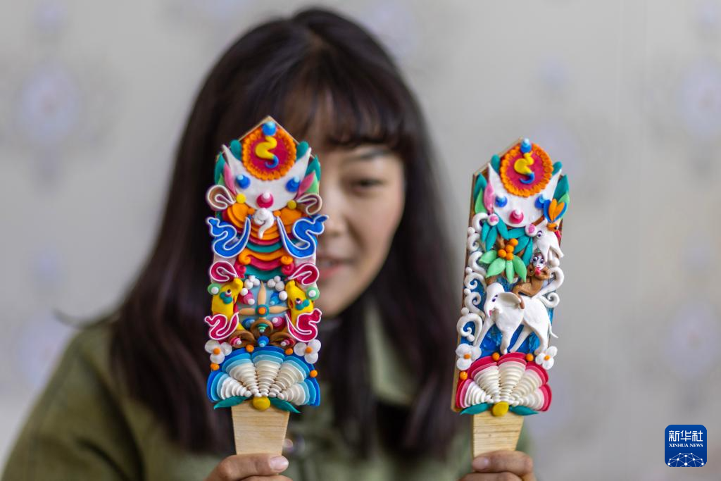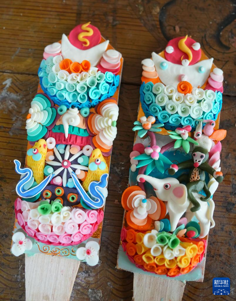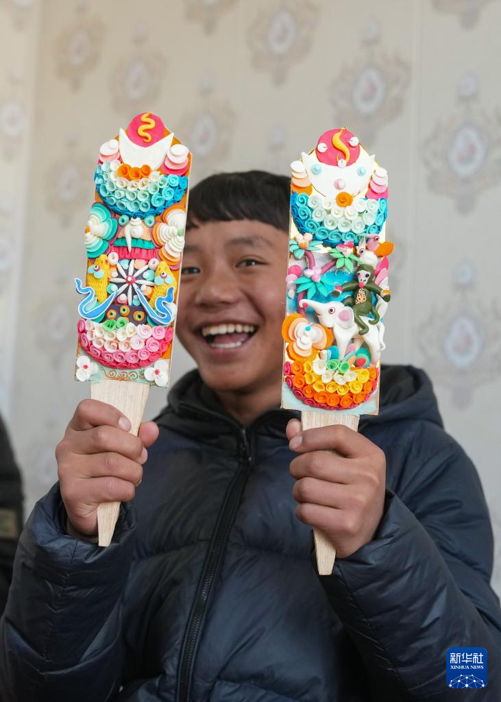 在拉薩市老城區(qū),小學(xué)徒在展示剛剛做好的一對酥油花(2月25日攝)。新華社記者 晉美多吉 攝?
