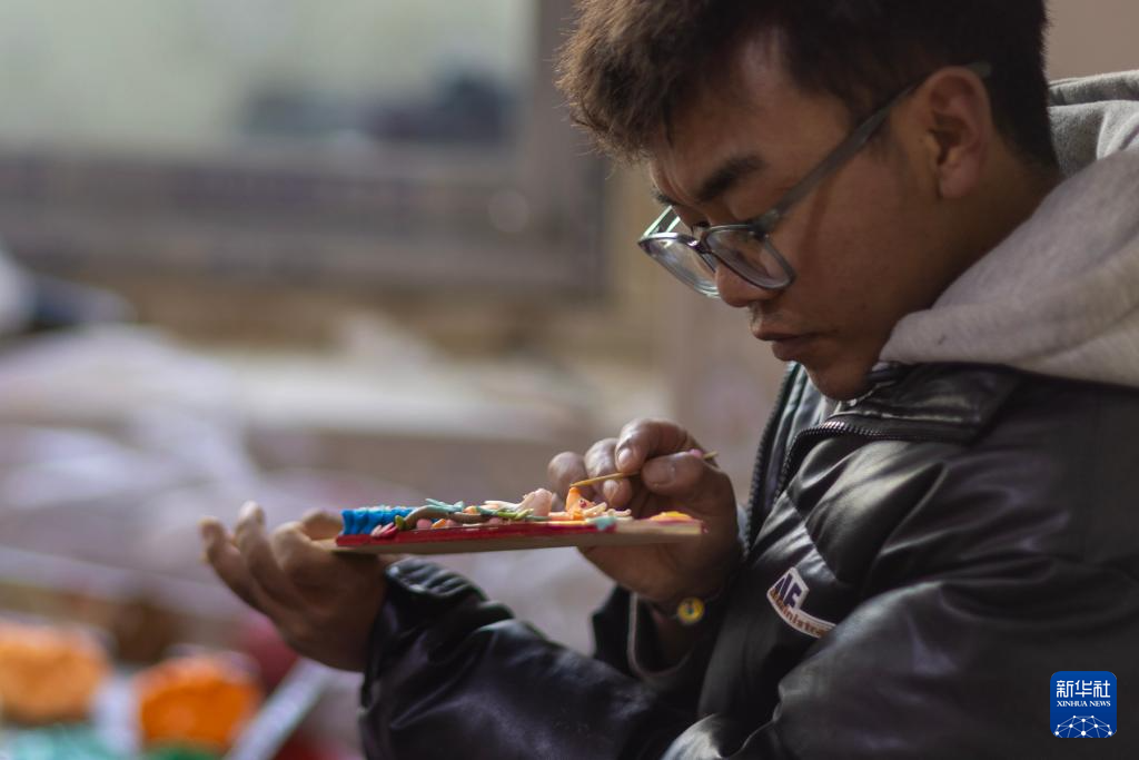 在拉薩市老城區(qū),手工藝人在捏制酥油花(2月25日攝)。新華社記者 晉美多吉 攝
