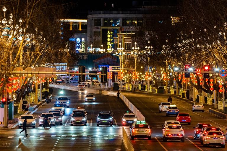 漫步在林廓東路北段、民族南路、北京中路……大街小巷都披上了藏歷新年的盛裝,新年元素琳瑯滿目,處處洋溢著節(jié)日的氣息。夜幕降臨,華燈初上,道路兩側(cè)樹上的燈籠和燈串開啟亮燈模式,街道在燈光的交相輝映下,傳遞出濃郁的年味,流光溢彩的街景也讓拉薩更顯活力,不時(shí)有人用手機(jī)定格此刻的畫面。