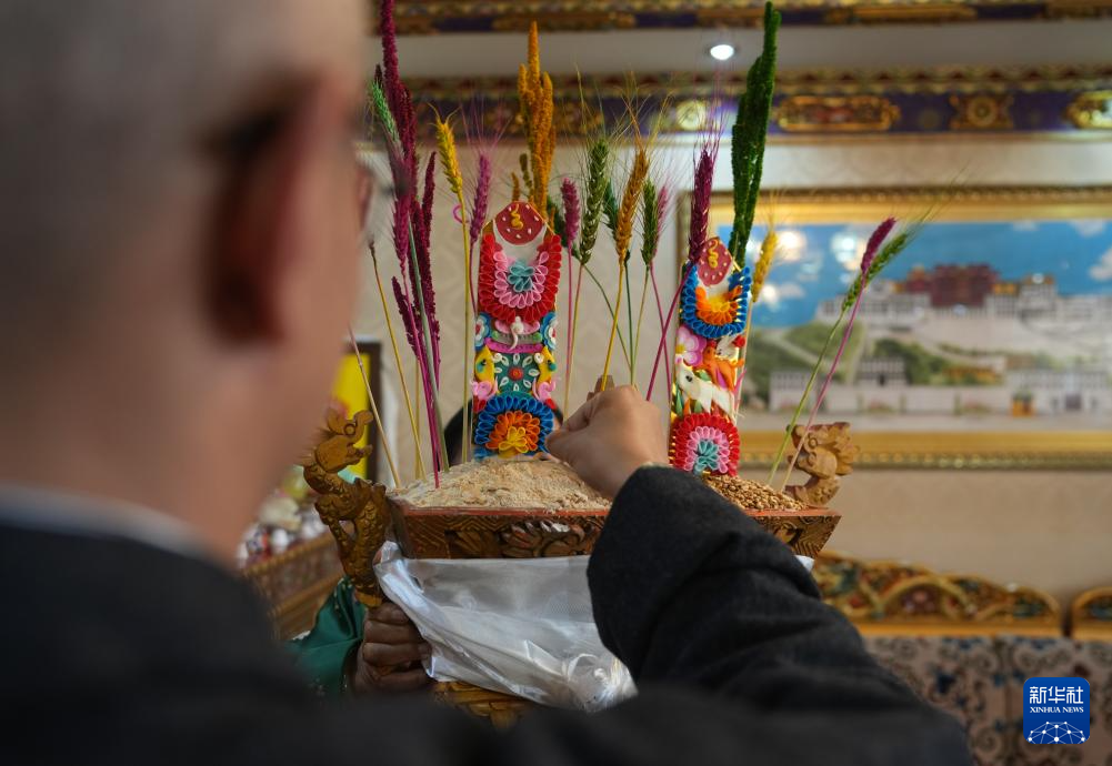 2月28日,身著藏裝的拉薩市民在敬獻(xiàn)青稞酒。新華社記者 晉美多吉 攝??