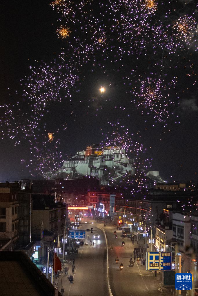 這是“古突”夜煙花映照下的布達拉宮(2月27日攝)。新華社記者 姜帆 攝