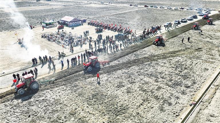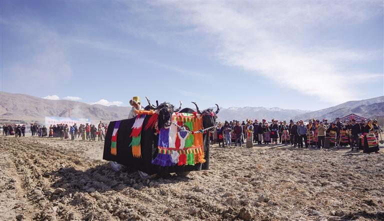 裝飾華美犄角掛飾的“機(jī)械牦?!薄侠瓩C(jī)緩緩駛?cè)胩锂?,在沉睡了一冬的凍土上犁出第一道深褐色溝壑。這一具有特殊意義的儀式過后,機(jī)械的轟鳴聲響徹田野,嶄新的犁地機(jī)、播種機(jī)閃亮登場。鋼鐵履帶滾滾向前,所到之處,土地被高效翻整;播種機(jī)精準(zhǔn)播撒,黑色的青稞種子顆顆入土。