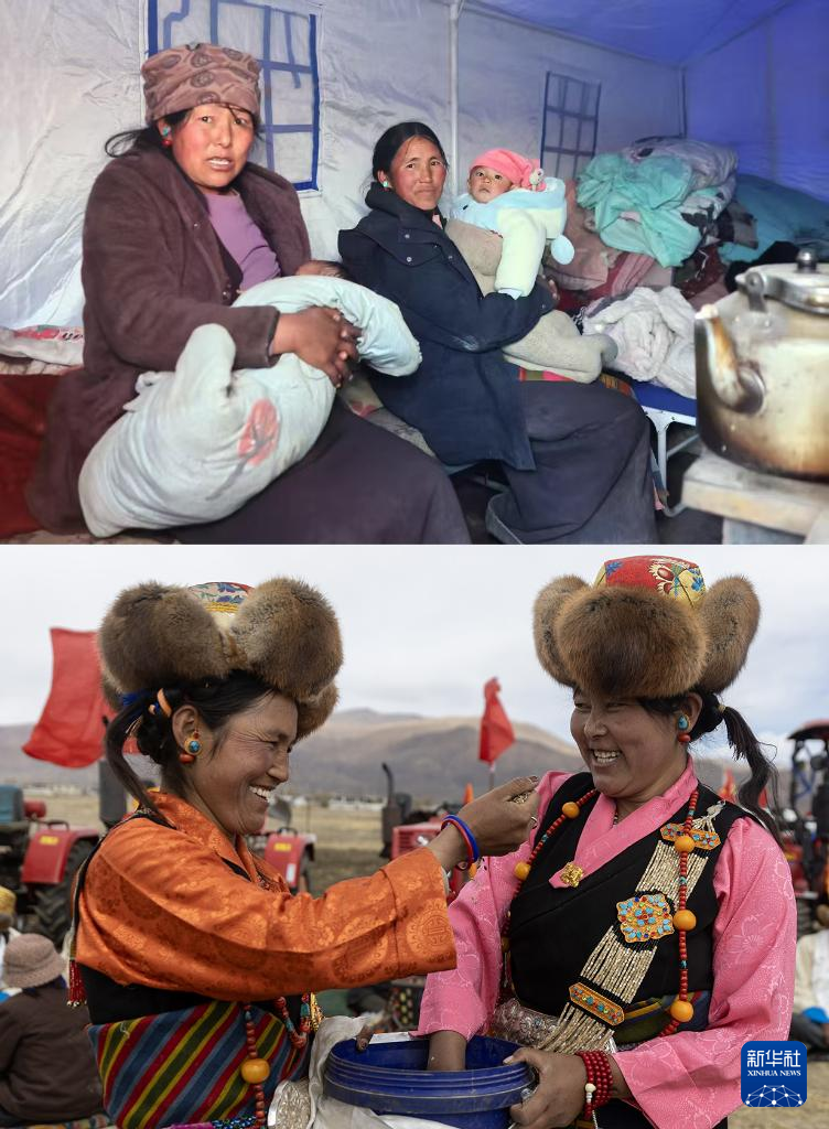 拼版照片:上圖為西藏日喀則市定日縣發(fā)生6.8級地震后,拉孜縣曲下鎮(zhèn)土林村受災群眾丹珍卓瑪(右)和吉拉在臨時搭建的救災帳篷中(1月7日攝);下圖為3月16日,拉孜縣曲下鎮(zhèn)土林村村民丹珍卓瑪(左)和吉拉在春耕典禮上檢查青稞種子。新華社記者 姜帆 攝
