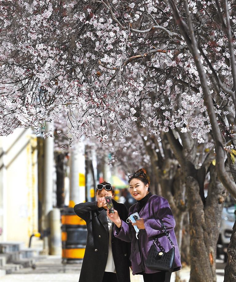 圖為市民在拉薩市軍民路盛開(kāi)的桃花下拍照。記者 洛桑 攝